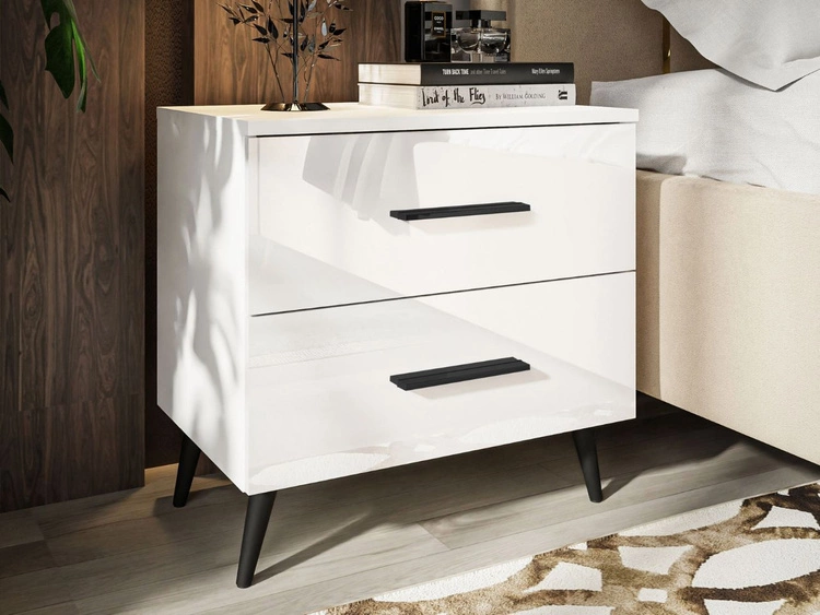 Nachttisch mit zwei Schubladen auf Schwarzen Beinen Nuveo Lux Weiß Hochglanz