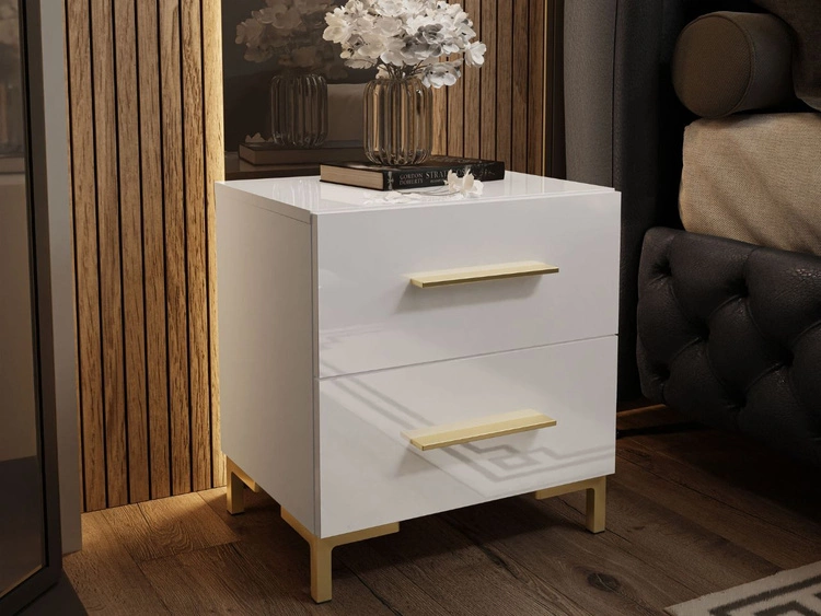 Nachttisch mit zwei Schubladen auf Schwarzen Goldenen Nuveo Lux Weiß Hochglanz
