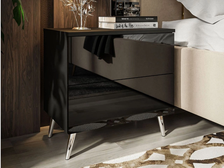 Nachttisch mit Schubladen auf Silbernen Metallbeinen Nuveo Schwarz Hochglanz