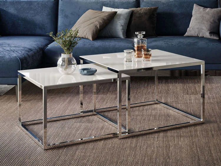 Couchtisch auf verchromtem Gestell mit Glasplatte Asumi Weiß 39x45