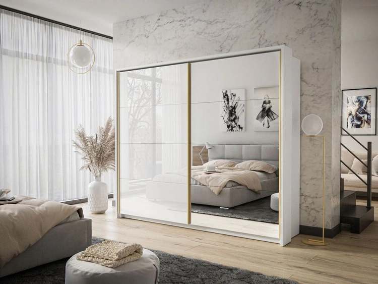 Ein Schwebetürenschrank mit Spiegel vereint zwei Funktionen in einem Möbelstück, wodurch er besonders platzsparend ist. Der integrierte Spiegel ermöglicht es Ihnen, sich beim Ankleiden zu betrachten, ohne zusätzlichen Platz für einen separaten Spiegel zu benötigen. Gleichzeitig reflektiert der Spiegel das Licht und lässt den Raum heller und größer erscheinen.