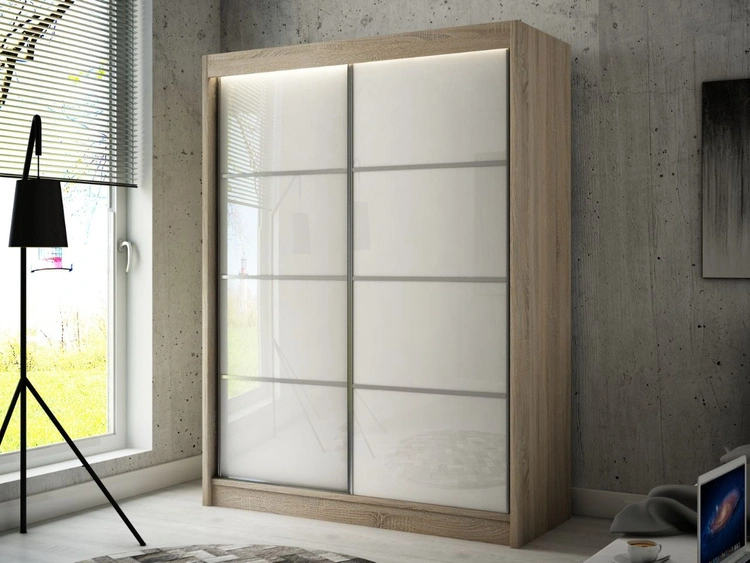 Anzahl der Produkte: 150Schiebetürenschrank mit Sprossen 150 cm mit LED-Beleuchtung Ponti Eiche Sonoma, Weiß