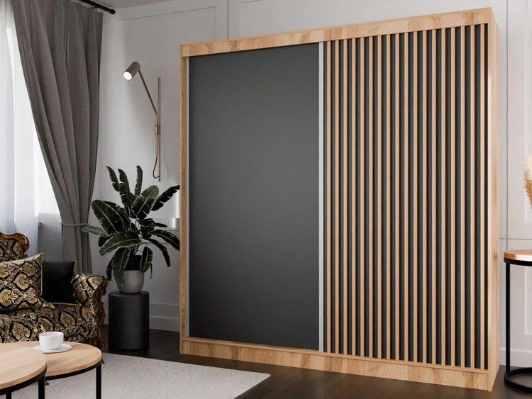 Schiebetürenschrank mit Lamellen 200 cm Loreto Handwerk Goldene Eiche, Schwarz