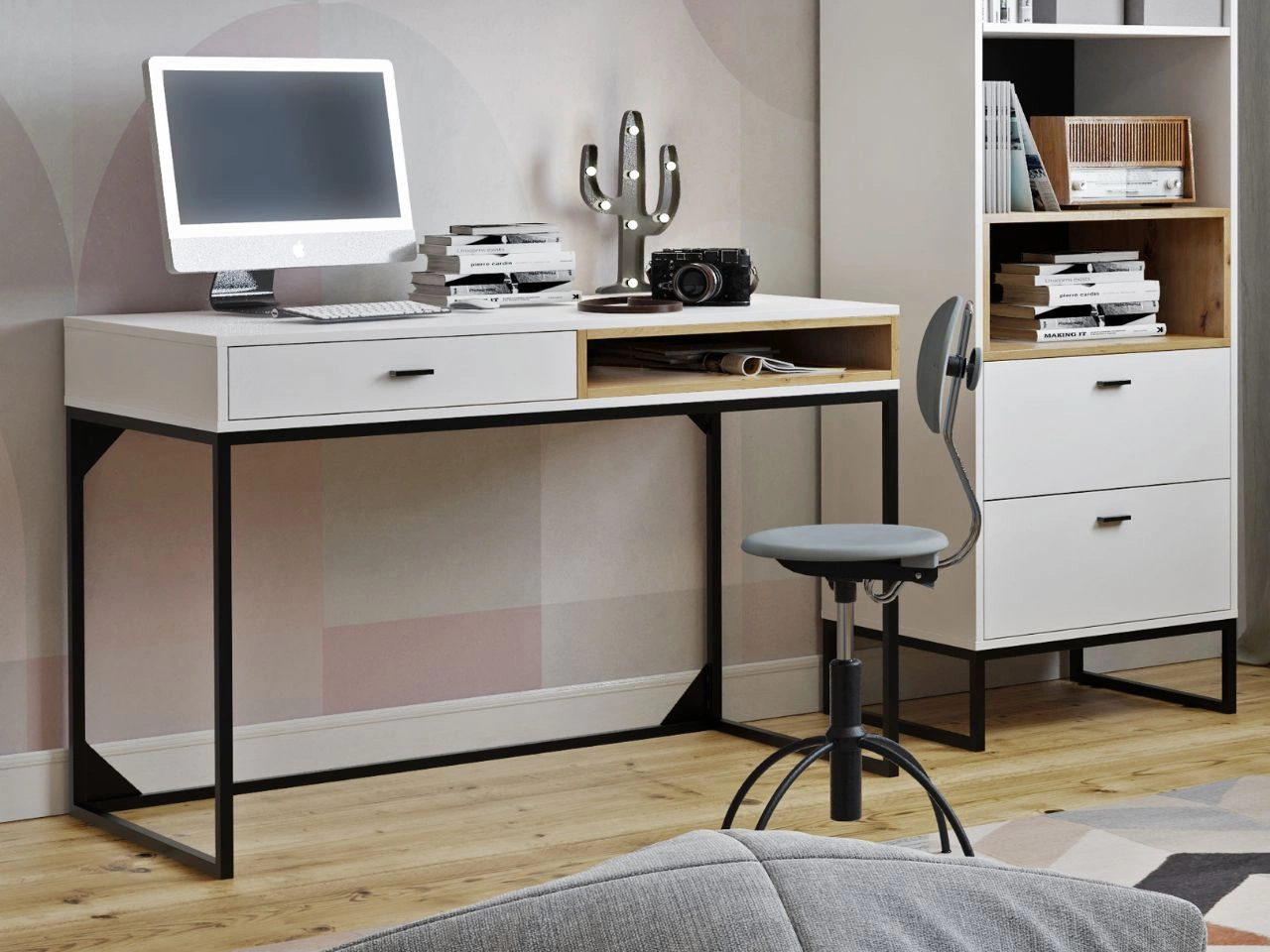 Der Schminktisch mit schwarz Metallbeinen Geneva in Weiß Artisan Eiche ist ein vielseitiges Möbelstück, das sowohl als Schminktisch als auch als kompakter Arbeitsplatz genutzt werden kann. Die Kombination aus weißer Oberfläche und schwarzen Metallbeinen verleiht ihm eine moderne, industrielle Ästhetik, die bei Jugendlichen sehr beliebt ist.