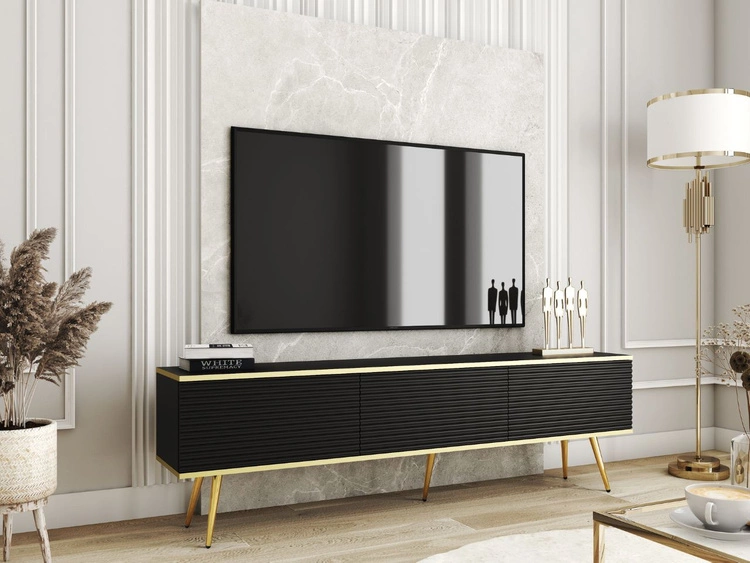 TV-Lowboard mit Türen 175 cm Diolo Schwarz mit geriffelter Vorderseite auf goldenen Beinen