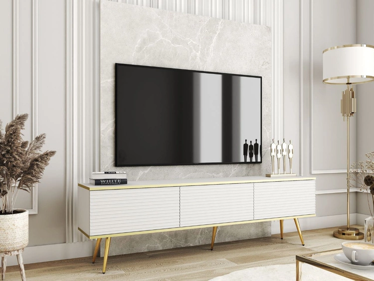 TV-Lowboard mit Türen 175 cm Diolo Weiß mit geriffelter Vorderseite auf goldenen Beinen