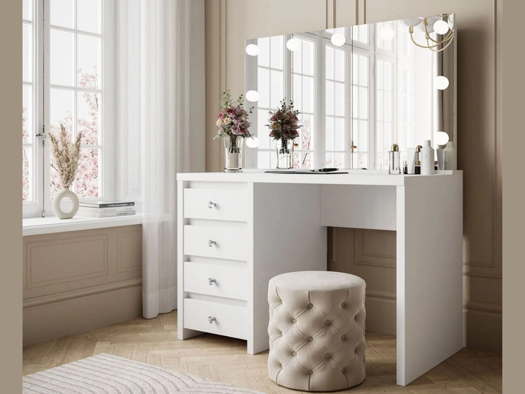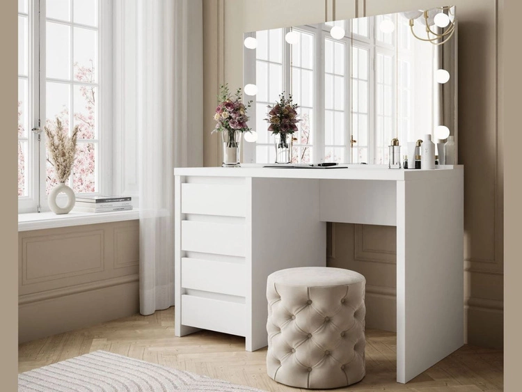 Schminktisch mit Schubladen, schwarzen Beinen und LED-Beleuchtung Olivine Weiß Hochglanz