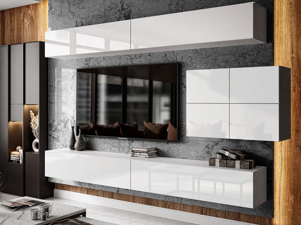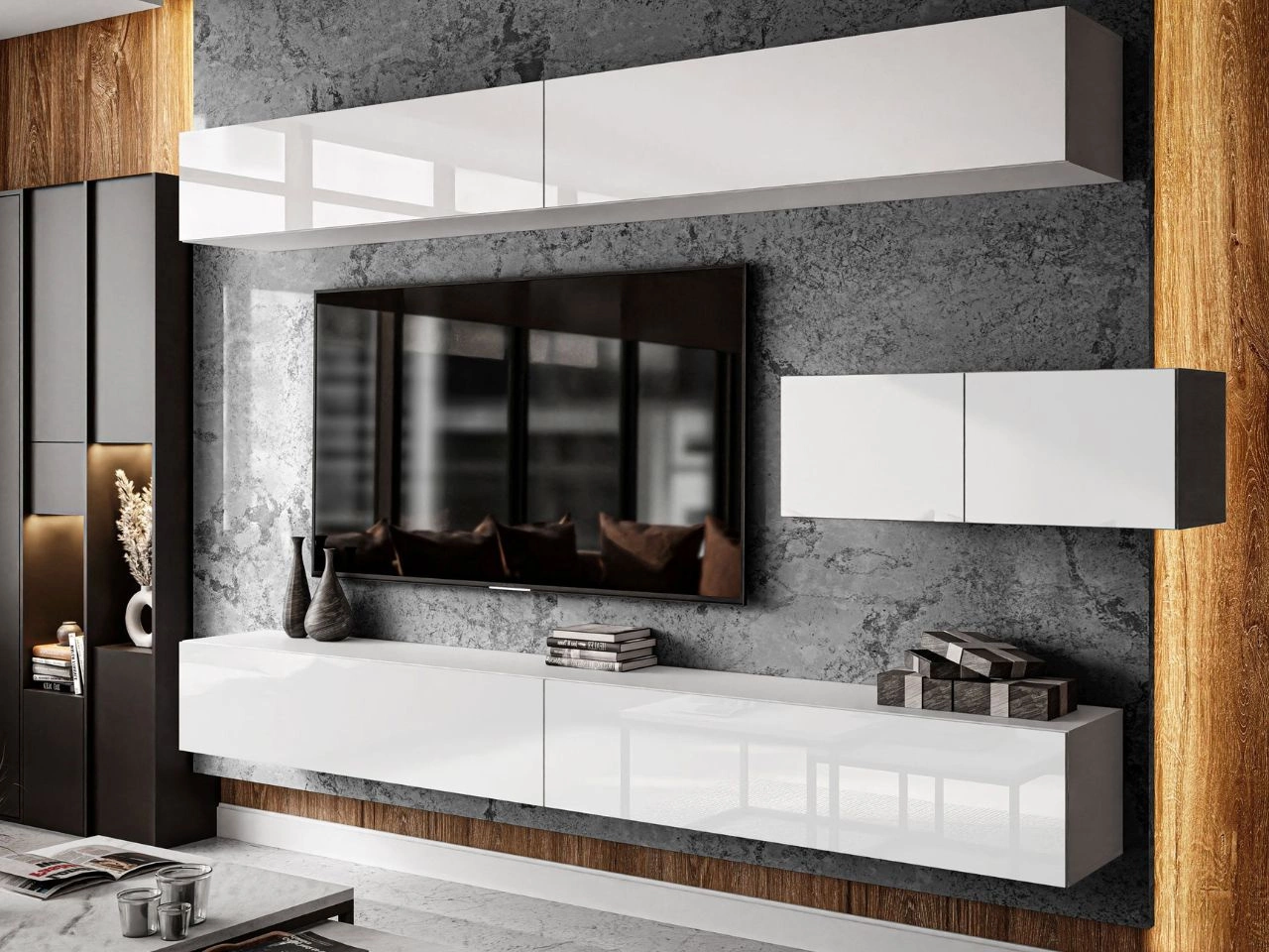 Hängende Wohnwand für das Wohnzimmer mit LED-Beleuchtung Nodoo Weiß Hochglanz