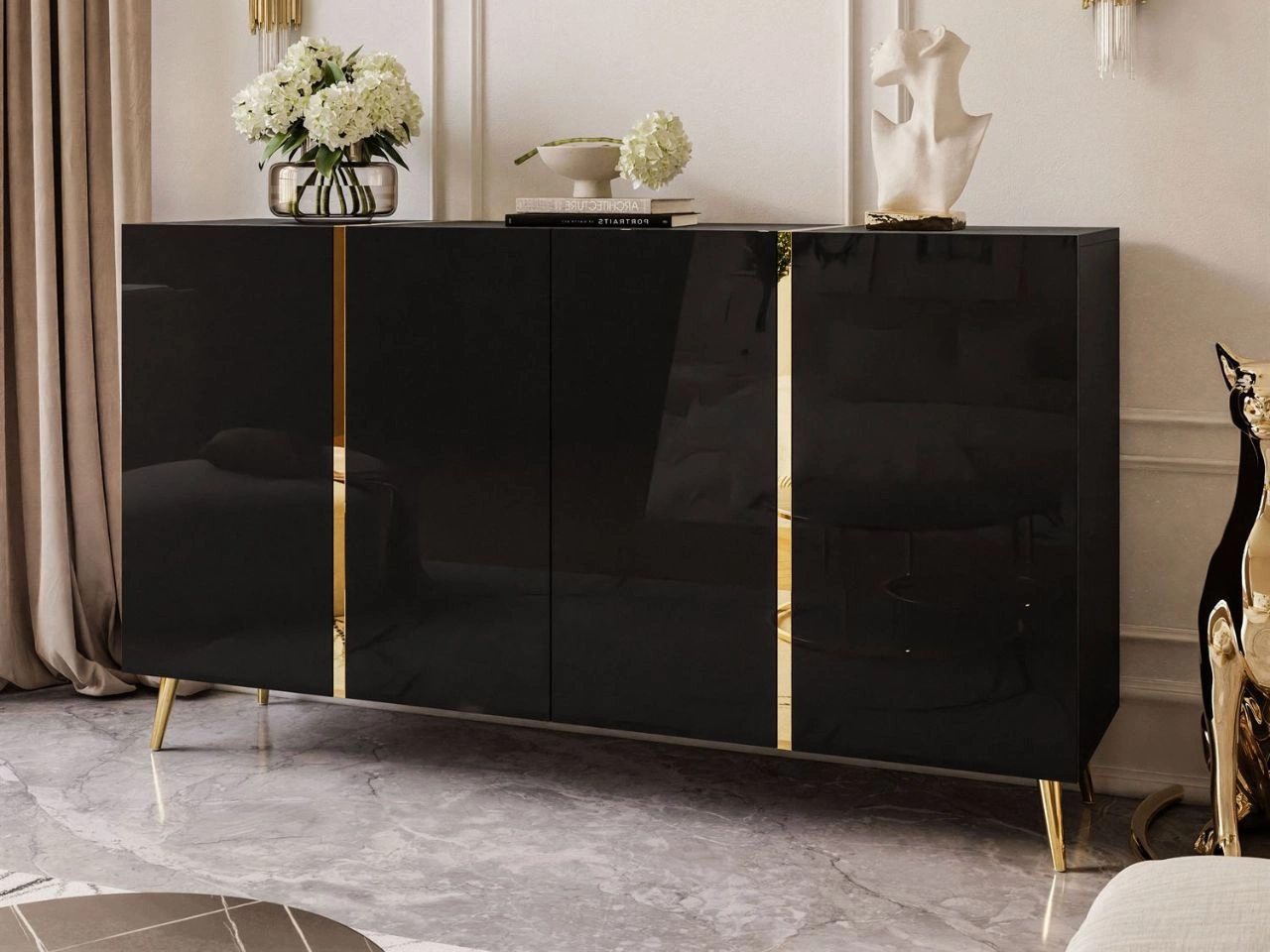 Viertürige Kommode 158 cm Glamour-Stil auf goldfarbenen Metallbeinen Lunelie Schwarzglanz