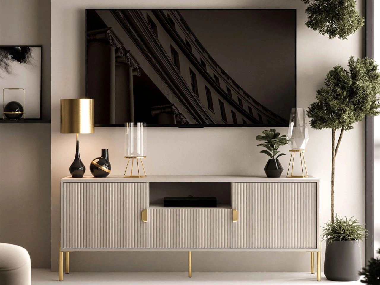 TV-Lowboard breit zweitürig mit Schublade und goldenen Metallfüßen Orlean Kaschmir Matt