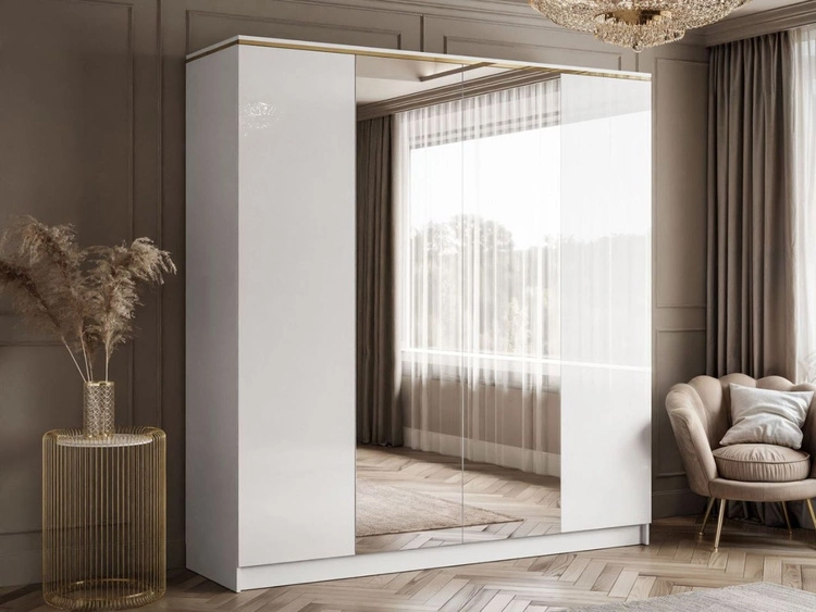 Kleiderschrank mit Spiegel 200 cm, mit Drehtüren und Schubladden Evare Weiß Hochglanz