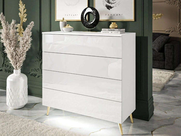 Kommode mit vier Schubladen und LED-Beleuchtung auf Goldenen Metallbeinen Nuveo Weiß Hochglanz