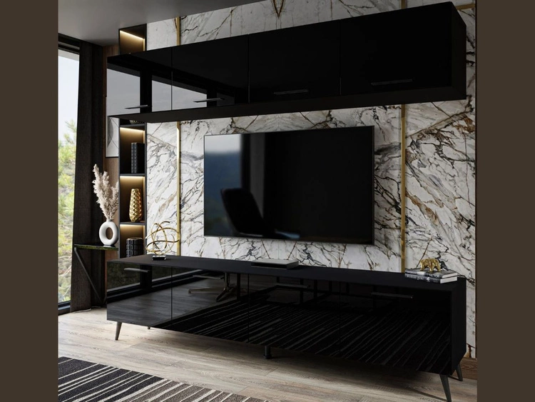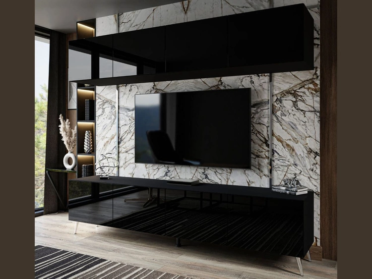 Hängende Wohnwand für das Wohnzimmer mit LED-Beleuchtung Nodoo Schwarz Hochglanz