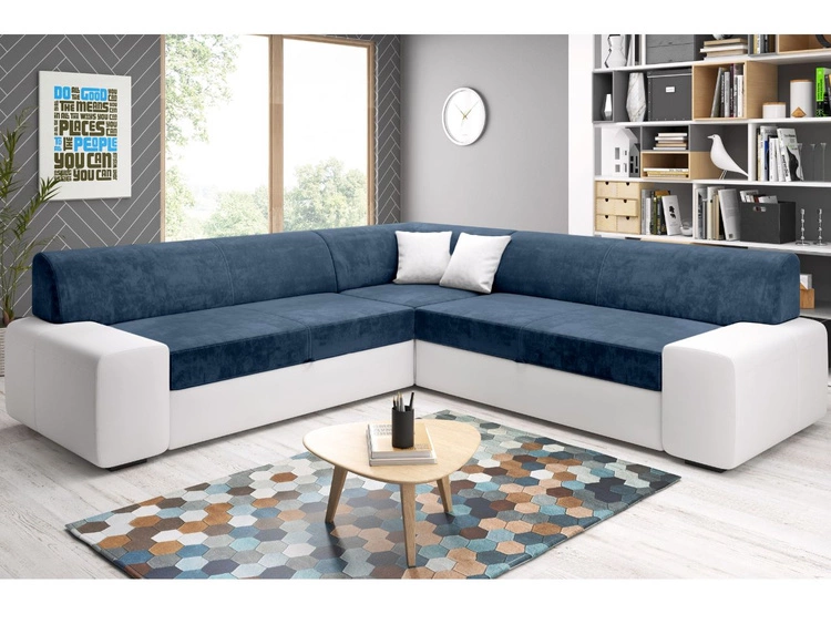 Ecksofa L-Form Rechts mit Schlaffunktion und Bettkasten Fresto Maxi Dunkelblau, Weiß