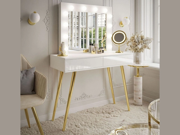 Schminktisch im Glamour-Stil mit Schubladen, Spiegel und LED-Beleuchtung Olivine Elite Weiß Hochglanz