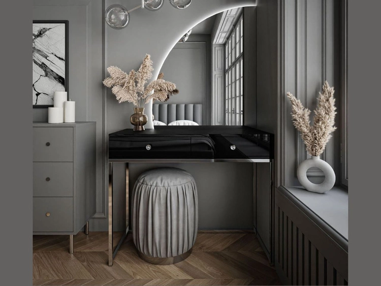Kosmetiktisch rechtsseitig mit Schubladen und LED-Beleuchtung auf silbernen Beinen Clarette Schwarz Hochglanz