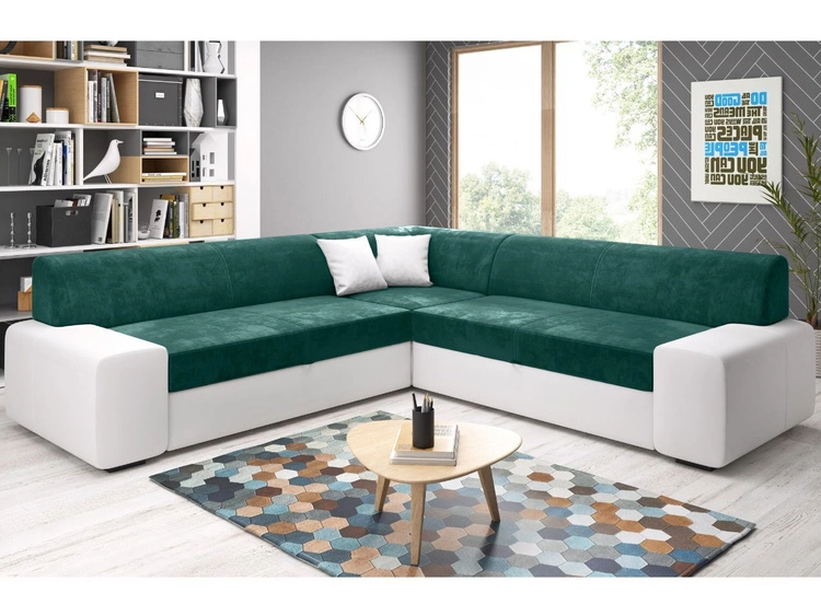 Ecksofa L-Form Rechts mit Schlaffunktion und Bettkasten Fresto Maxi Dunkelgrün, Weiß