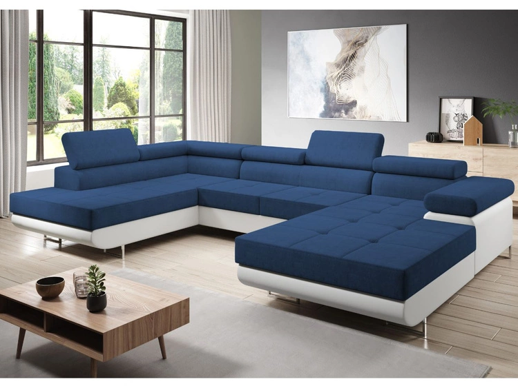Wohnlandschaft Links mit Schlaffunktion und Bettkasten Solam U Marineblau, Weiß