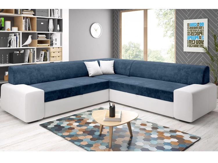Ecksofa L-Form Links mit Schlaffunktion und Bettkasten Fresto Maxi Dunkelblau, Weiß