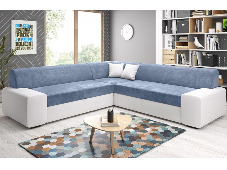 Ecksofa L-Form Rechts mit Schlaffunktion und Bettkasten Fresto Maxi Blau, Weiß