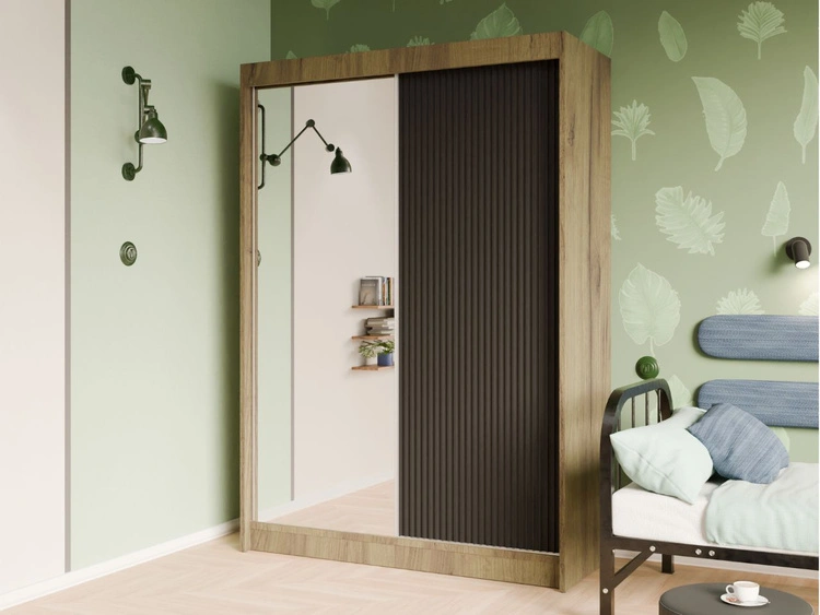 Anzahl der Produkte: 70Schiebetürenschrank mit geriffelter Front und Spiegel 150 cm Fano Handwerk Goldene Eiche, Schwarz