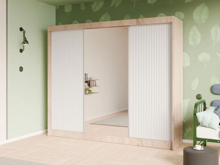 Schiebetürenschrank mit geriffelter Front und Spiegel 250 cm Fano Eiche Sonoma, Weiß