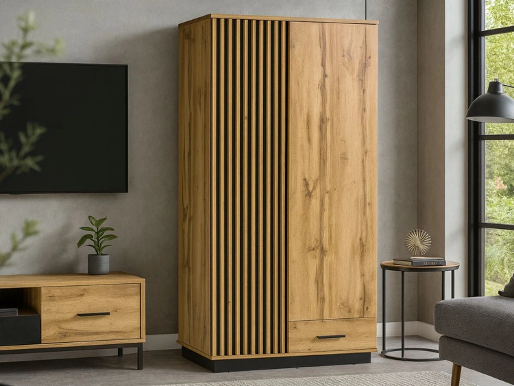Kleiderschrank 90 cm mit Lamellen und Flügeltüren für das Wohnzimmer Lavore Wotan Eiche, Schwarz matt