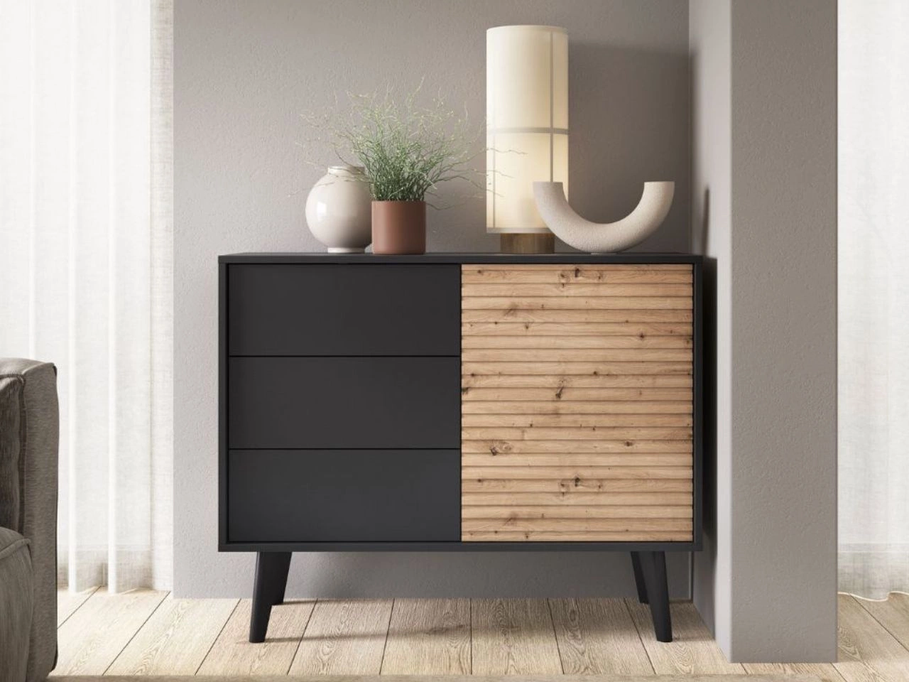 Kommode mit Türe und Schubladen Astro Schwarz, Artisan Eiche