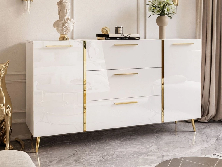 Anzahl der Produkte: 254Zweitürige Kommode 158 cm mit drei Schubladen und goldenen Griffen Lunelie Weißglanz