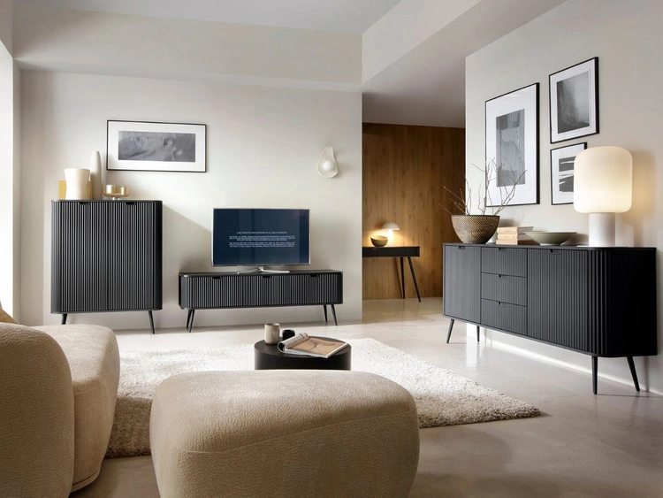 Wohnzimmer-Set – TV-Schrank und Kommode auf schwarzen Füßen Asumi Schwarz und Eiche Wotan
