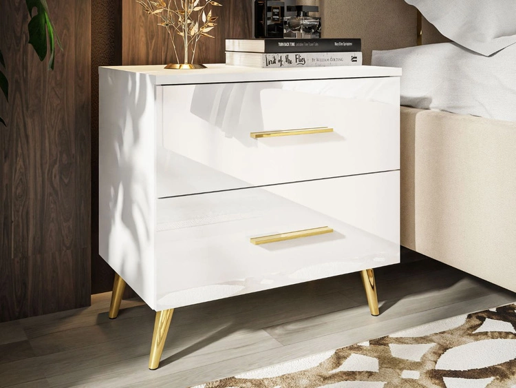 Nachttisch mit zwei Schubladen auf Schwarzen Goldenen Nuveo Lux Weiß Hochglanz