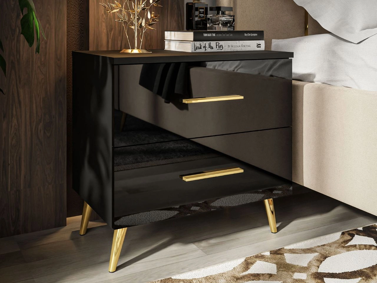 Nachttisch mit Schubladen auf Goldenen Metallbeinen Nuveo Schwarz Hochglanz