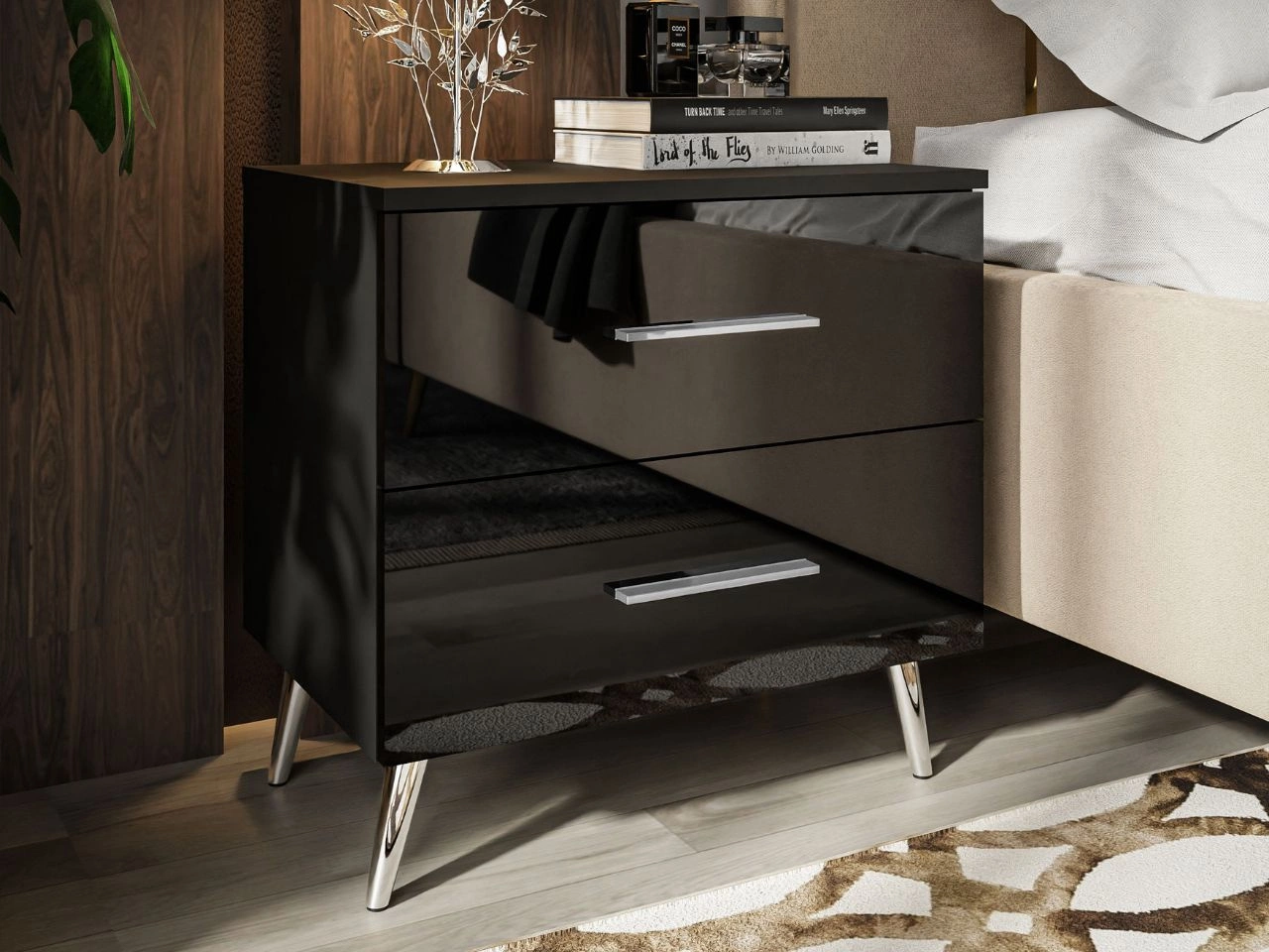 Nachttisch mit Schubladen auf Silbernen Metallbeinen Nuveo Schwarz Hochglanz