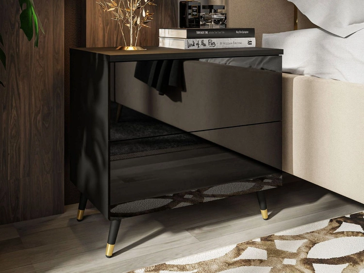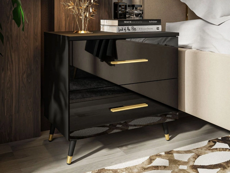 Nachttisch mit Schubladen auf Schwarz-Goldenen Metallbeinen Nuveo Schwarz Hochglanz