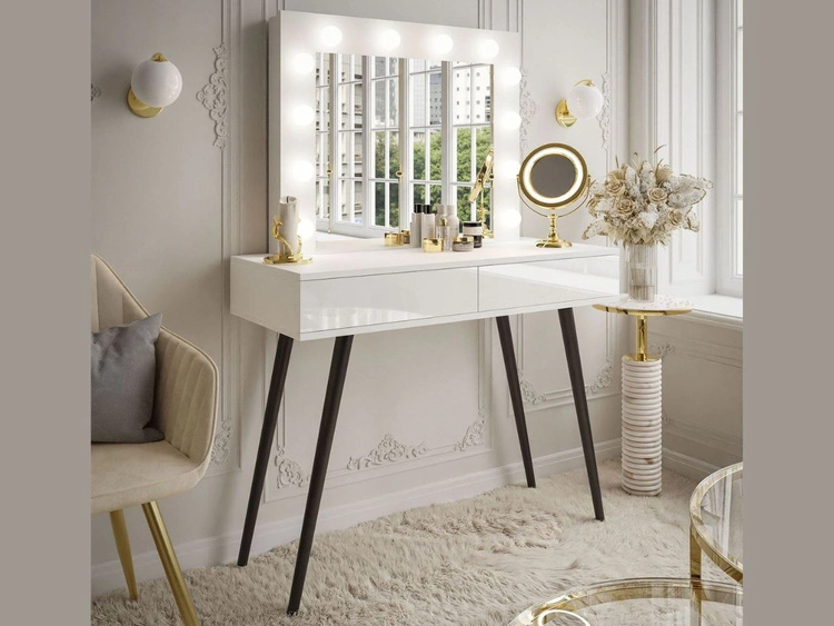 Anzahl der Produkte: 106Schminktisch mit Schubladen, schwarzen Beinen und LED-Beleuchtung Olivine Weiß Hochglanz