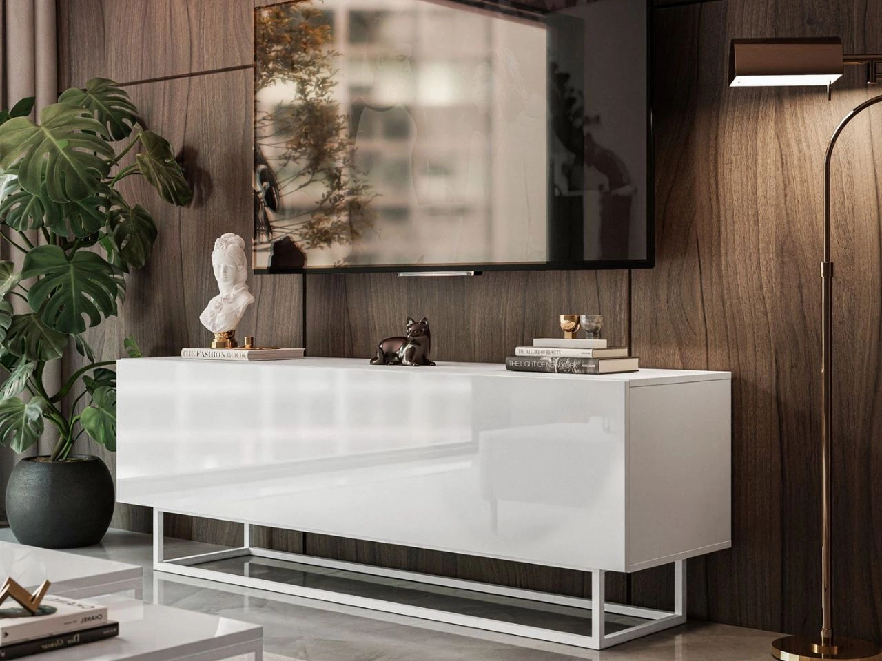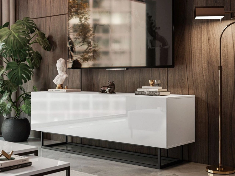TV-Schrank mit gefrästen Fronten und schwarzen Metallbeinen Vionel Weiß glänzend