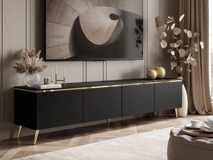 TV-Lowboard breit zweitürig mit Schublade und goldenen Metallfüßen Orlean Schwarz Matt