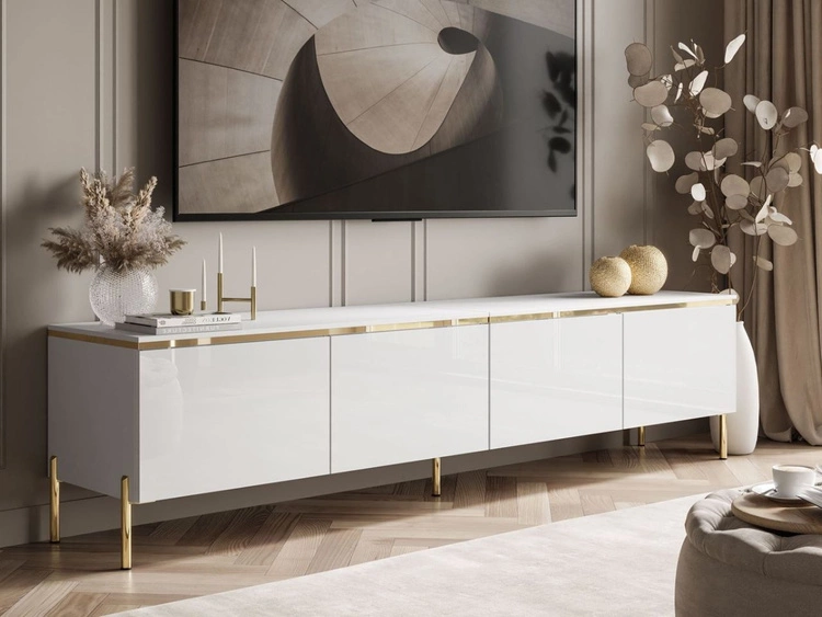 TV-Lowboard mit zwei Türen auf goldenen Beinen 175 cm mit LED-Beleuchtung Sorelle Weiß Hochglanz