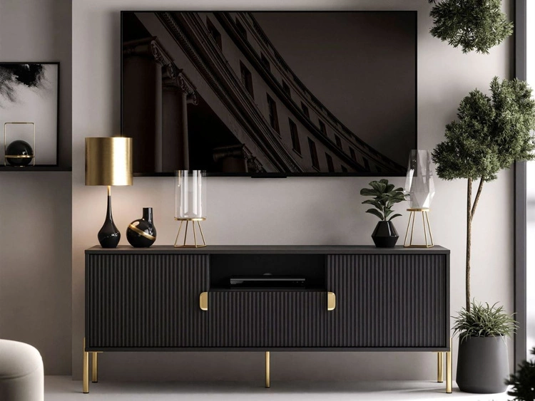 TV-Lowboard breit zweitürig mit Schublade und goldenen Metallfüßen Orlean Schwarz Matt