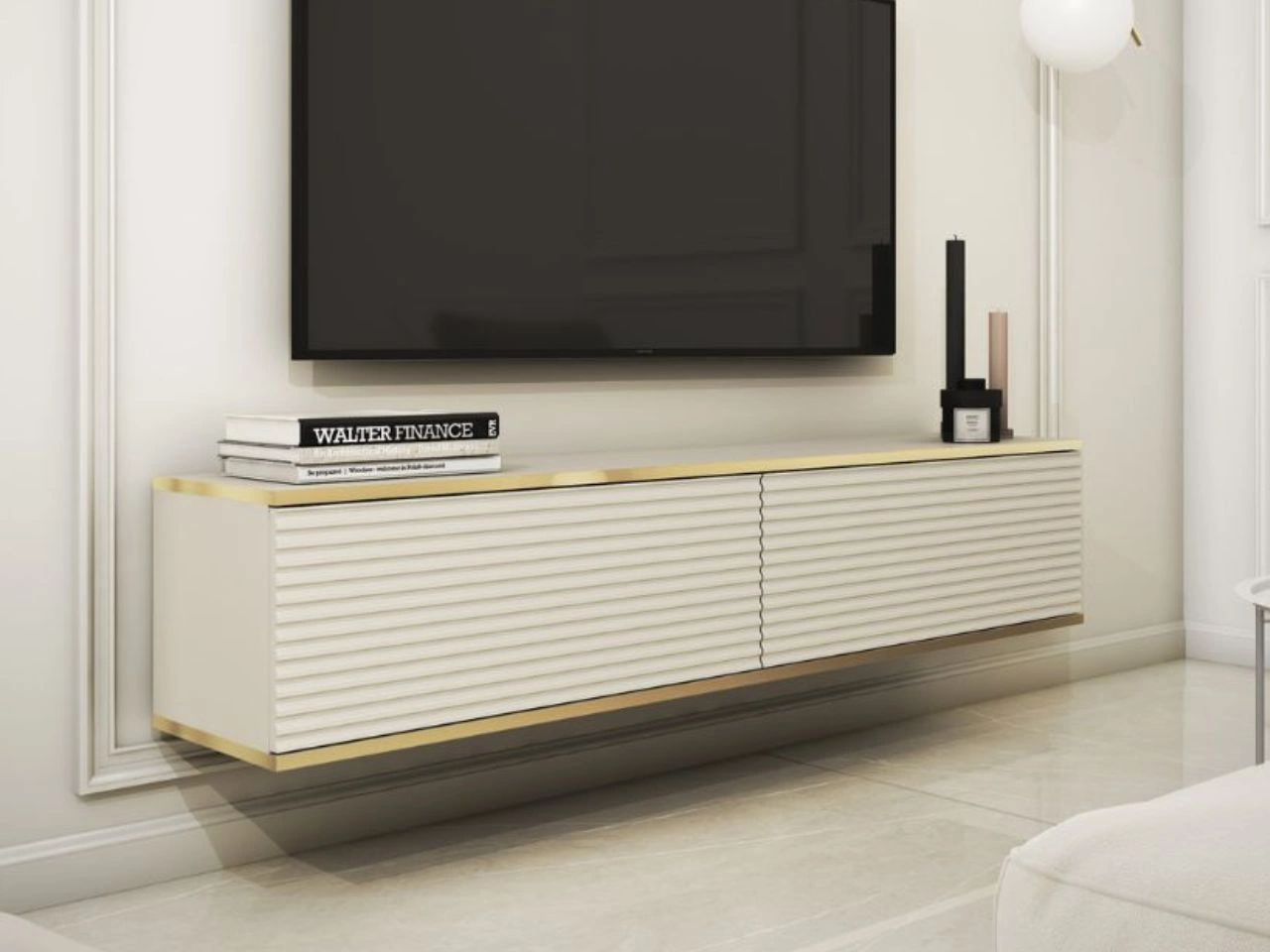 TV-Lowboard mit Türen 135 cm Diolo Weiß mit geriffelter auf goldenen Beinen