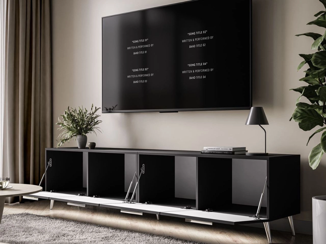 Korpus des Lowboards besteht aus strapazierfähiger, 16 mm starker laminierter Platte, die Langlebigkeit und stabile Nutzung garantiert. Die breite Oberplatte eignet sich ideal zur Präsentation von Dekorationen, Erinnerungsstücken oder TV-Geräten – sie bietet funktionalen und stilvollen Stauraum.