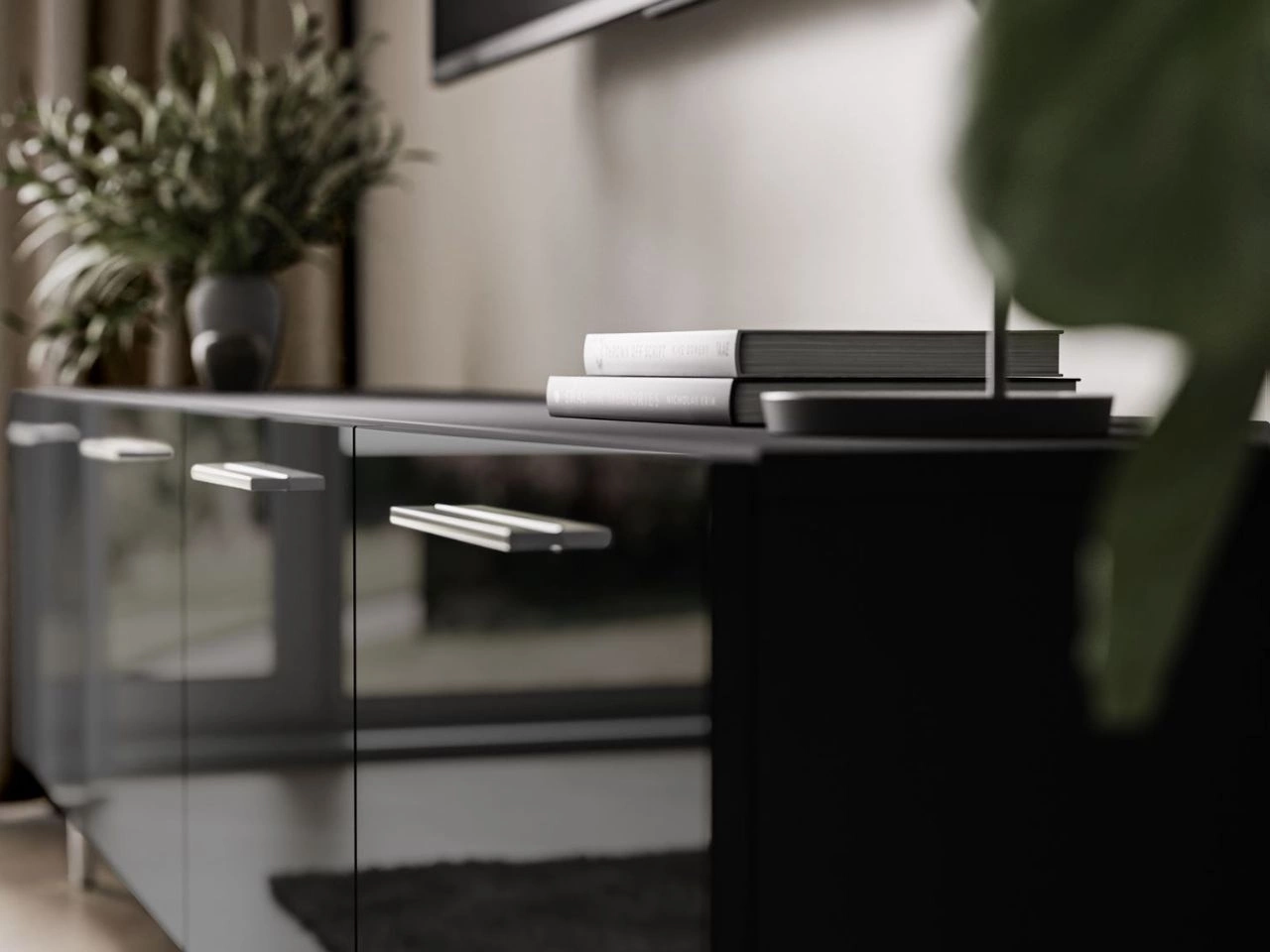 Front besteht aus Hochglanzplatte mit Acrylbeschichtung, die für eine elegante Optik sorgt und gleichzeitig kratzfest ist. Dezente Griffe ermöglichen ein komfortables Öffnen der Fronten und bewahren gleichzeitig den modernen Charakter des Möbels sowie seine glatte, minimalistische Form. Die gesamte Konstruktion steht auf hohen, schlanken und schräg gestellten Beinen, die dem Möbelstück eine leichte Optik verleihen, das Reinigen erleichtern und die praktische Nutzung des Raums unter dem Lowboard ermöglichen.
