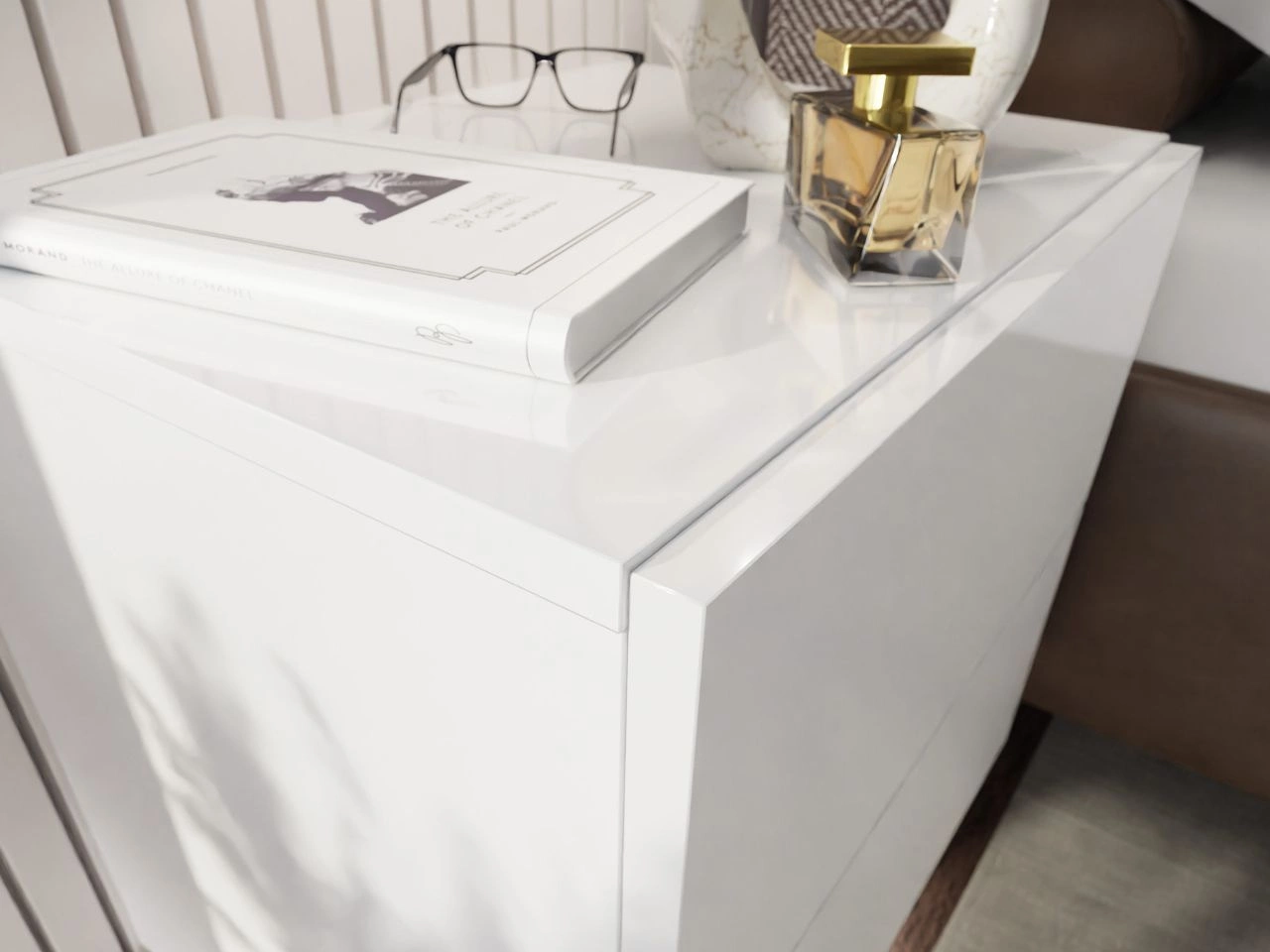 Nachttisch besteht aus einer robusten laminierten Platte, während die Fronten im Hochglanz gefertigt sind, was den eleganten Charakter des Möbels unterstreicht und seine Widerstandsfähigkeit im Gebrauch erhöht. Die Schubladenfronten sind mit ABS-Kanten versehen, die für eine ästhetische Verarbeitung sorgen und die Kanten zusätzlich vor Beschädigungen schützen. Die Schubladen laufen auf langlebigen Kugelführungen, die für leises und reibungsloses Öffnen sorgen. Das PUSH-TO-OPEN-System erhöht den Bedienkomfort und betont den modernen Charakter des Möbelstücks. Die hängende Konstruktion des Nachttisches verleiht ihm Leichtigkeit und Eleganz und erleichtert zugleich die Reinigung des Bodens darunter.