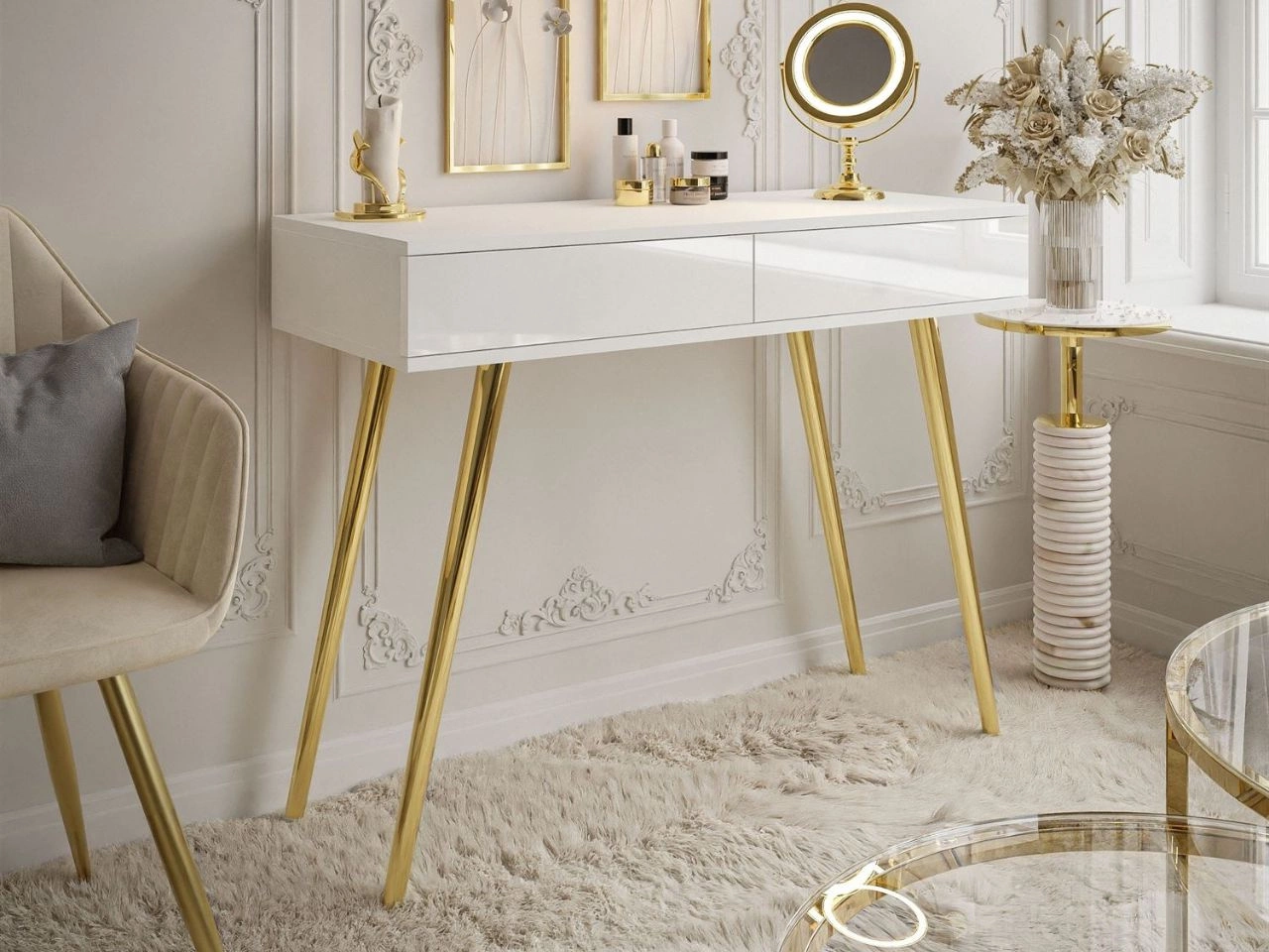 Die weiße Konsole Olivine mit goldenen Beinen überzeugt durch einen reduzierten, modernen Look. Die Fronten bestehen aus hochwertiger Platte in Hochglanz, während der Korpus in dezentem Matt gehalten ist. Zwei Schubladen auf Kugelführungen mit Vollauszug bieten komfortablen Zugriff; geöffnet werden sie über das Push-to-Open-System („Drücken zum Öffnen“). Das macht Olivine auch als Schminktisch mit Schubladen besonders praktisch.