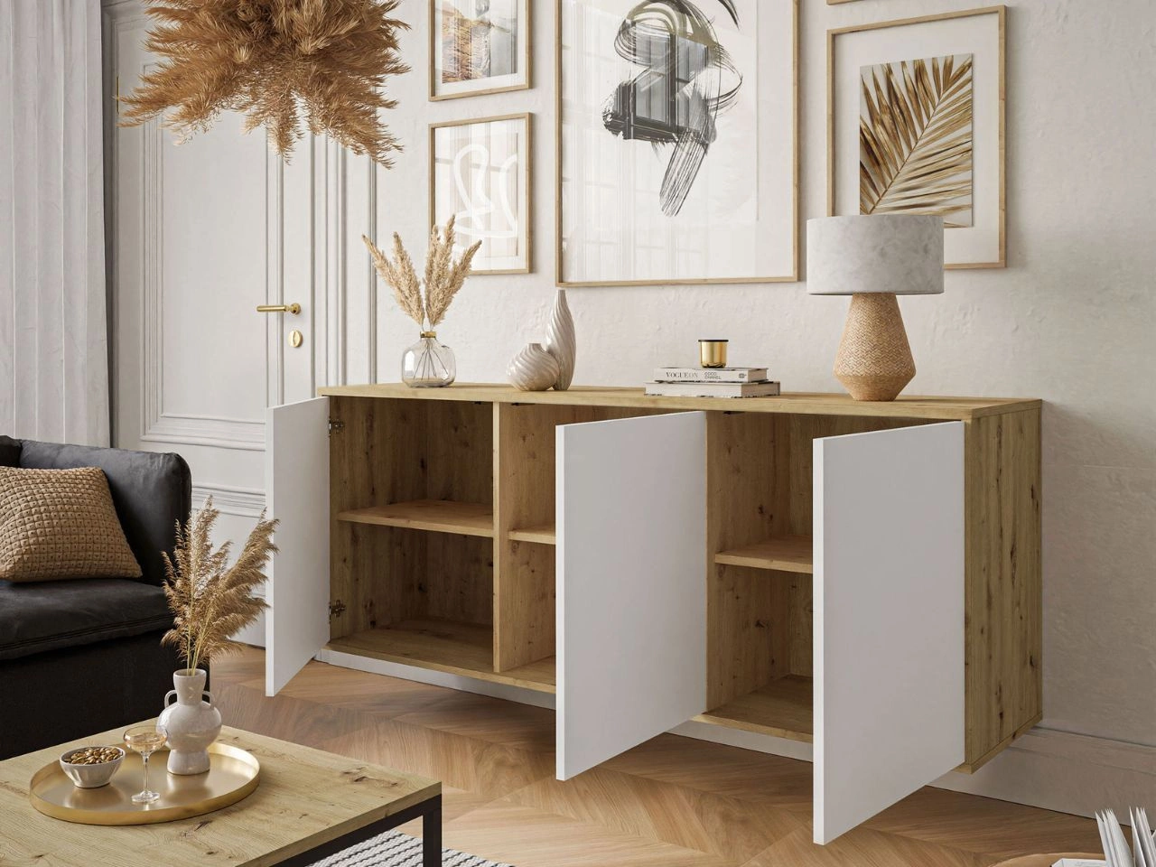 Die Kommode Vivance verfügt über Fronten und Korpus in matter Ausführung. Hier treffen weiße Türen auf eine Deckplatte und Seiten im Farbton Eiche Artisan. Der Korpus steht auf Kunststoffbeinen in Weiß. Zusätzlich ist ein mittleres Standbein angebracht, das die Konstruktion stabilisiert und die Last gleichmäßig verteilt.