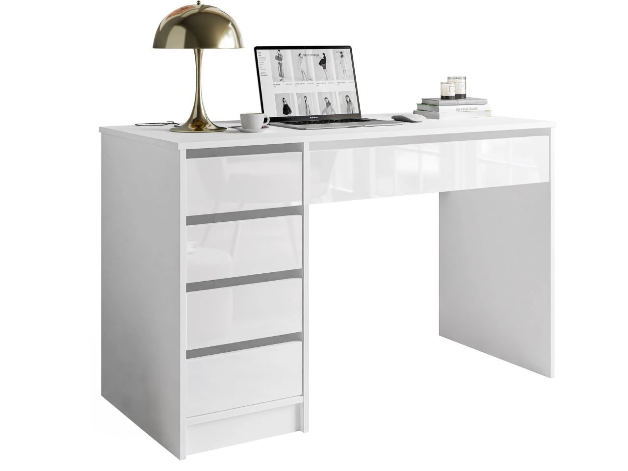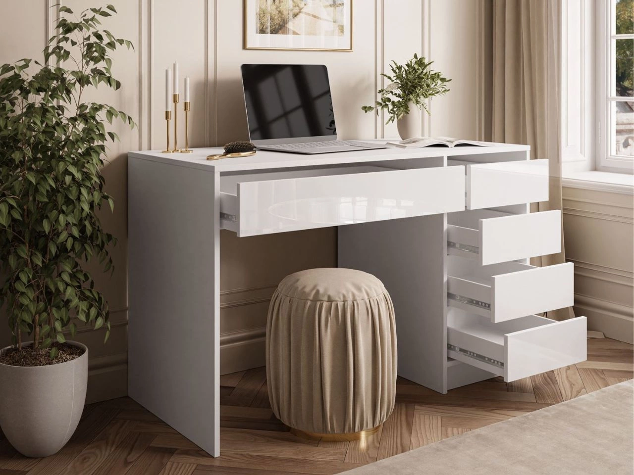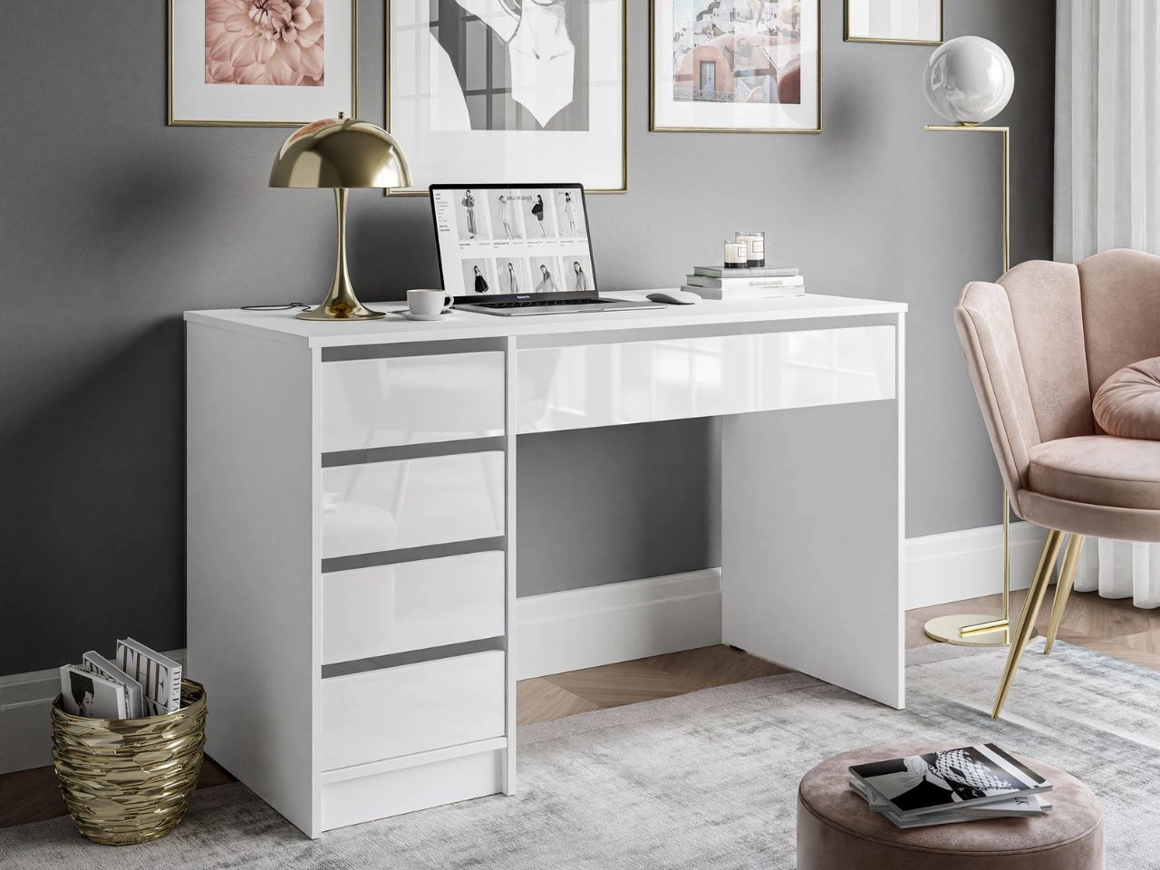 Du ziehst an: Schreibtisch mit fünf Schubladen Melo Weiß Hochglanz