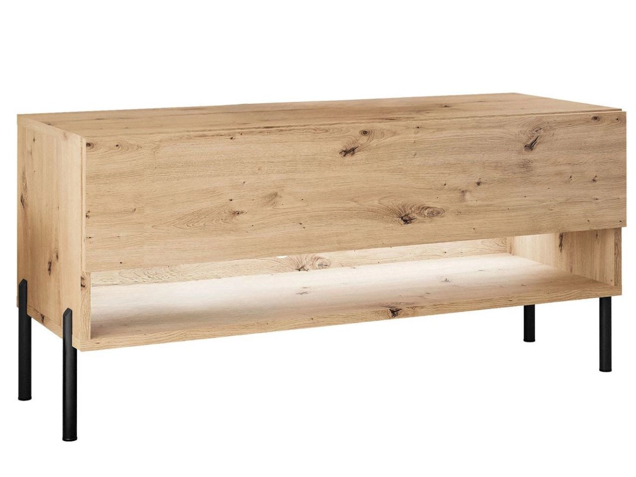 Der warme, natürliche Artisan-Eiche-Holzton bringt Behaglichkeit in Ihr Wohnzimmer und fügt sich sowohl in moderne als auch in industrielle Wohnkonzepte perfekt ein. Matte Fronten und Korpus unterstreichen die klare Linienführung, während schwarze Metallbeine einen eleganten Kontrast setzen. Die LED-Beleuchtung in Kaltweiß hebt die Holzstruktur hervor, sorgt für ein angenehmes Ambiente und macht die TV-Kommode zu einem echten Blickfang.
