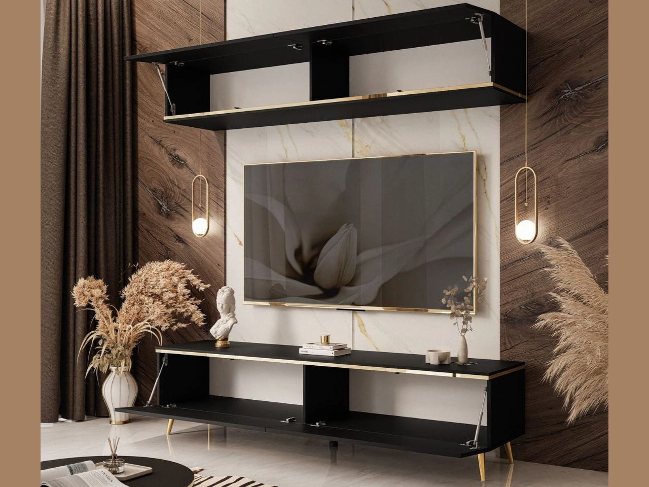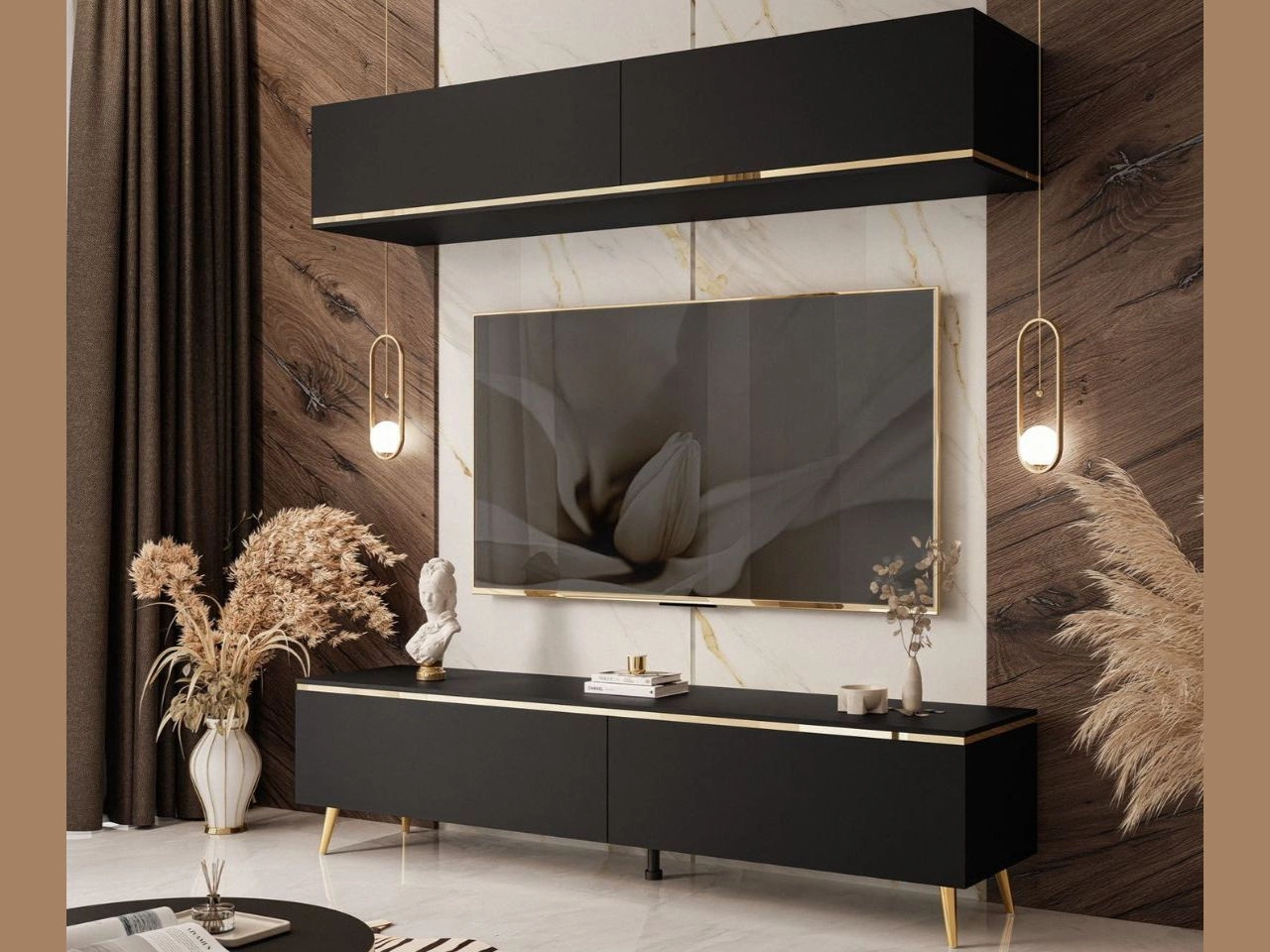 Fronten im modernen Farbton schwarz wirken dezent und elegant, während der dekorative goldene Streifen den exklusiven Stil des gesamten Sets betont. Die Wohnwand umfasst geräumige obere und untere Schränke, die ausreichend Platz für die Aufbewahrung von Accessoires, Dokumenten oder Multimedia-Geräten bieten. So bleibt Ordnung im Raum gewahrt, während Dekorationen und Wohnaccessoires stilvoll zur Geltung kommen.