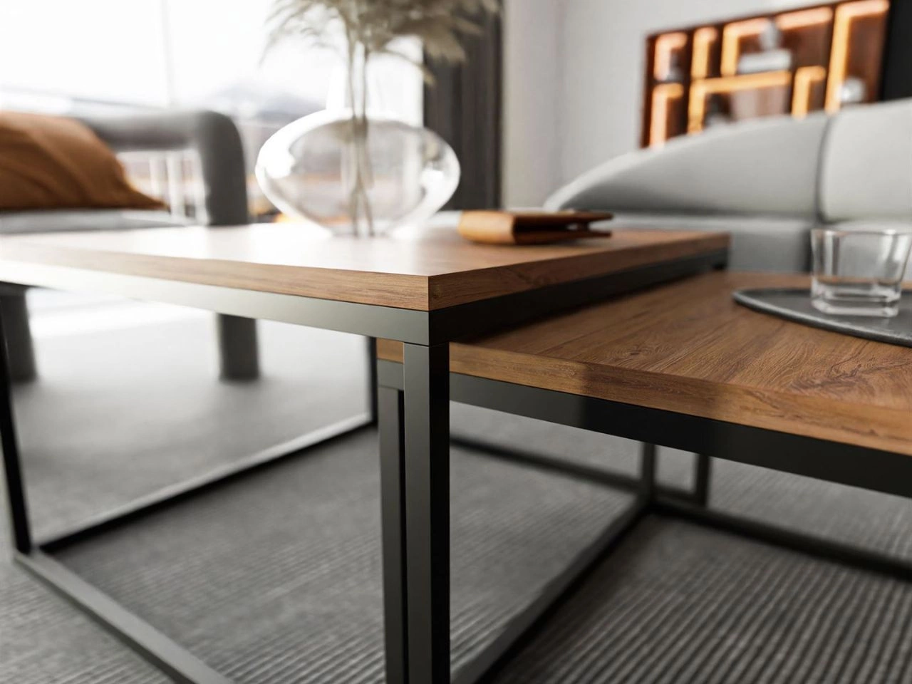 Tischplatten aus laminiertem Holzwerkstoff in Holzoptik begeistern durch ihre realistische Maserung und verleihen dem Raum eine gemütliche Atmosphäre. Die Kombination aus warmen Holztönen und einem schwarzen Stahlgestell sorgt für einen ausdrucksstarken Kontrast, der dem Set ein modernes, stilvolles Erscheinungsbild verleiht. Das Ensemble wirkt leicht und elegant und ist nicht nur ein praktisches Möbelstück, sondern auch ein dekoratives Highlight im Wohnzimmer.