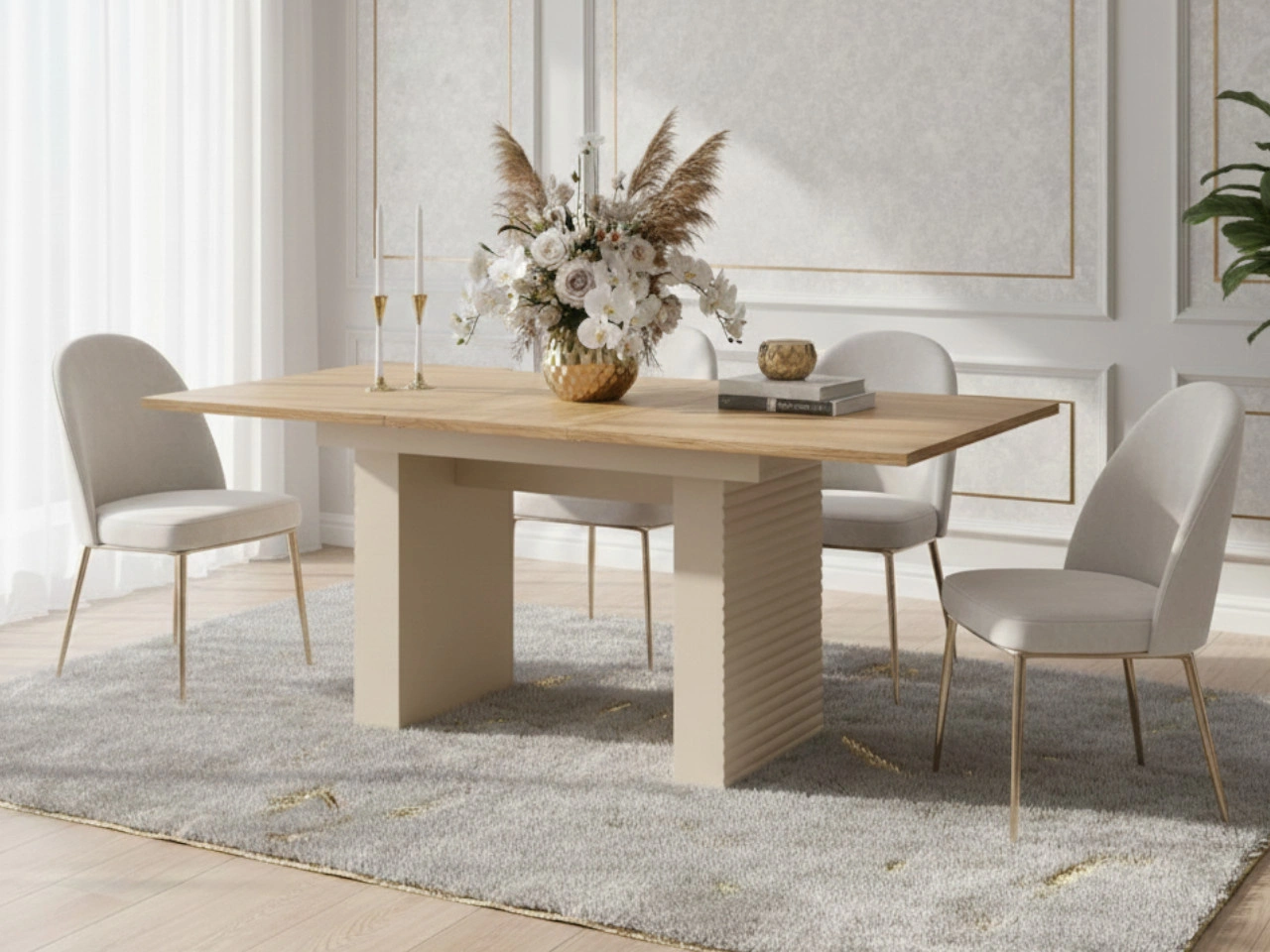 Ausziehbarer Tisch Rapallo ist ein funktionaler und stilvoller Esstisch, der sich ideal für moderne Essbereiche sowie Wohnräume mit offener Küche eignet. Die Kombination aus einer Tischplatte im Dekor Eiche geölt und einer hellen Basis in Kaschmir verleiht dem Tisch eine elegante und zugleich zeitlose Ausstrahlung, die perfekt zu modernen, skandinavischen und minimalistischen Einrichtungsstilen passt.